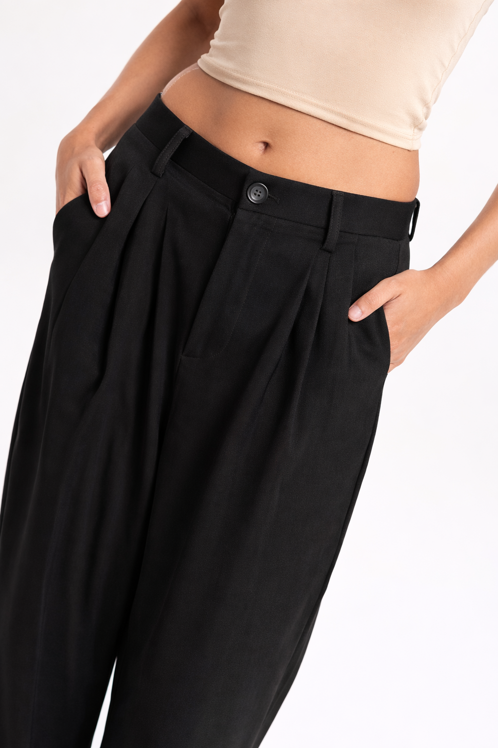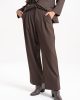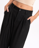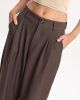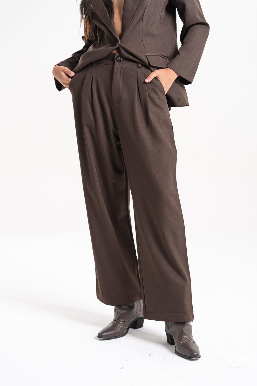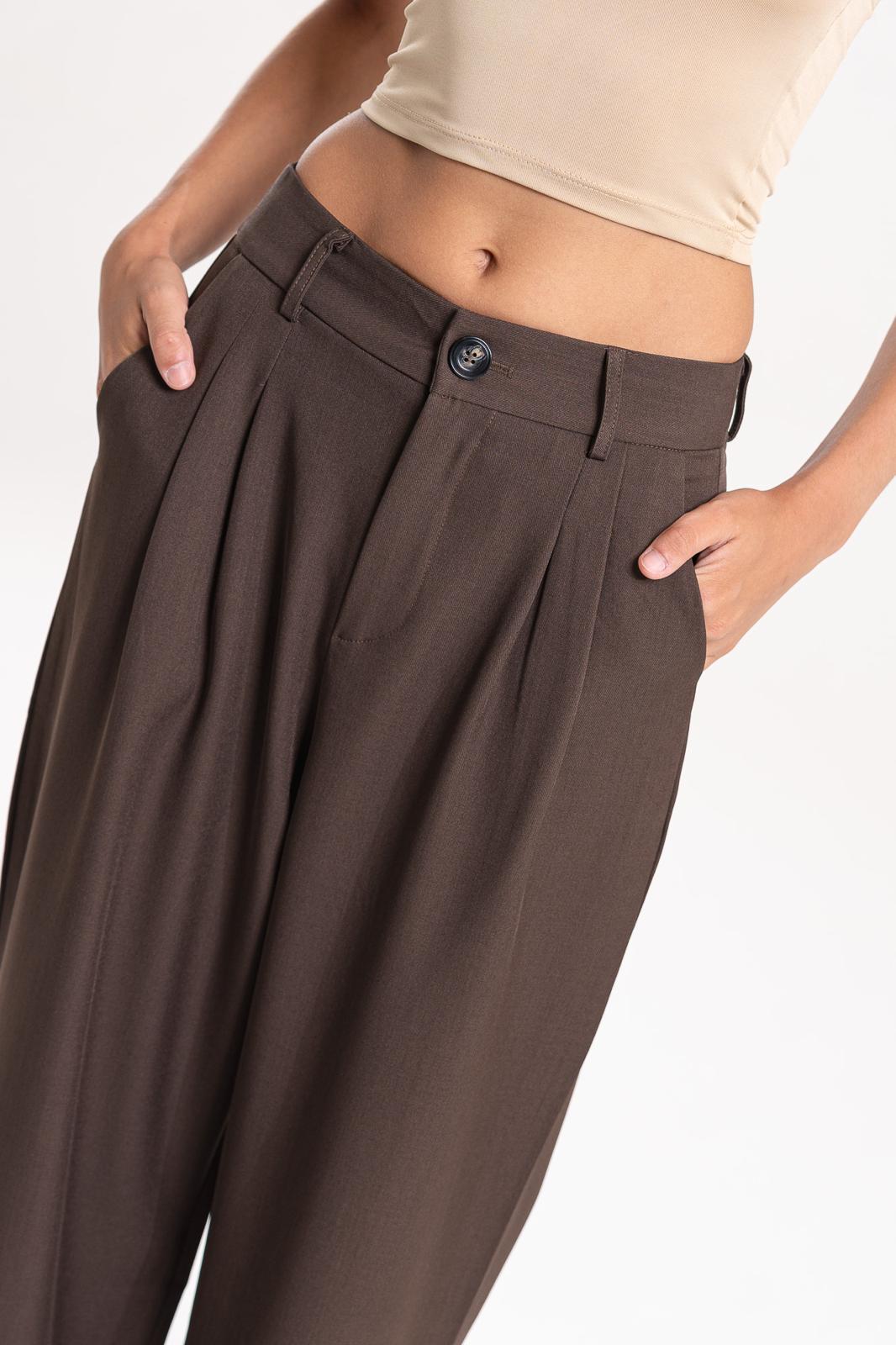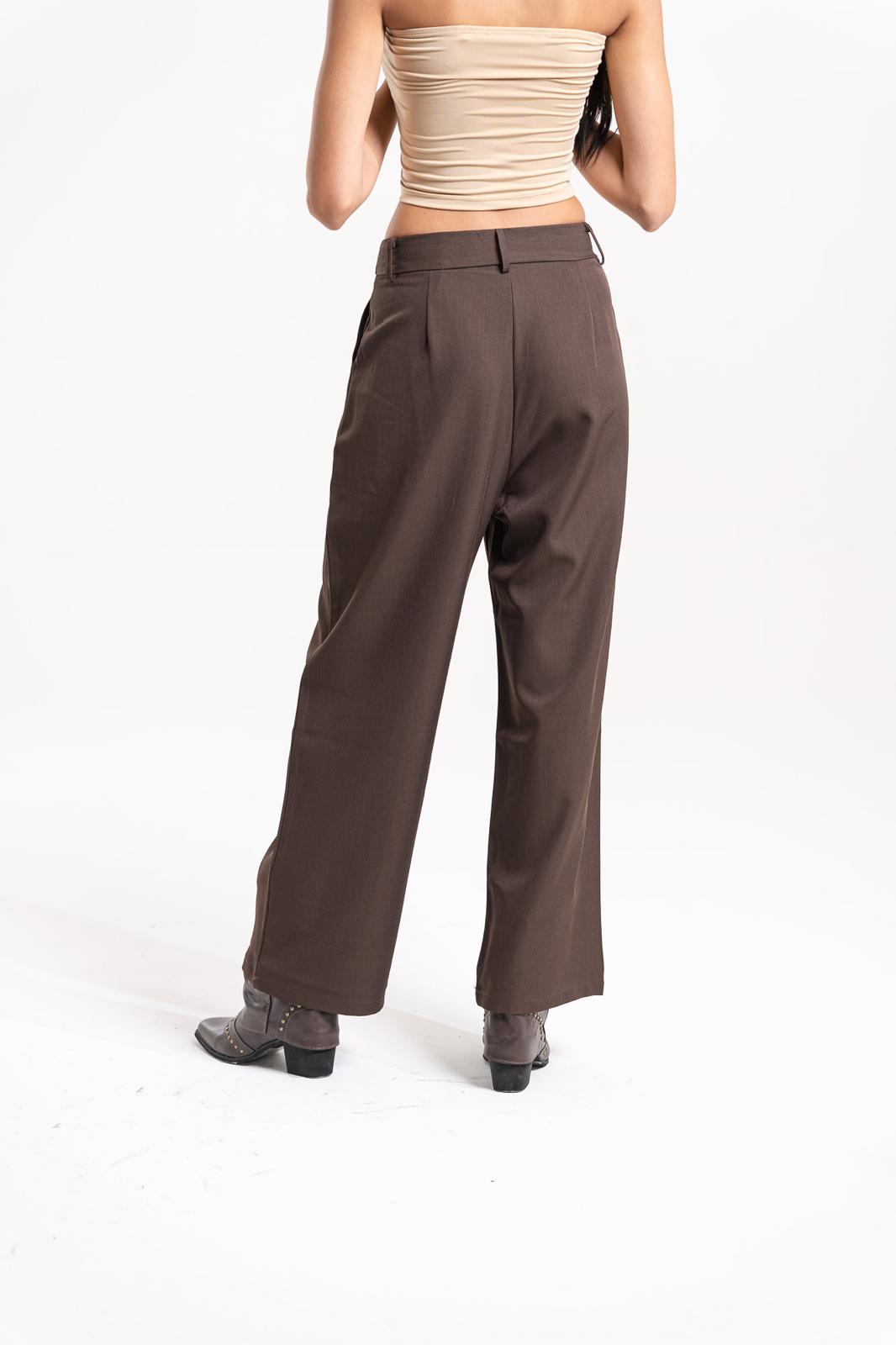 Pantalón sastrero de tiro alto con calce amplio y pinzas frontales que aportan movimiento y elegancia. Confeccionado en tejido plano de caída suave, cuenta con bolsillos laterales y cierre frontal con botón.